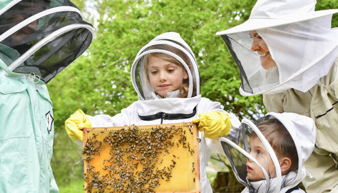 Kronprinsessan Victoria är biodlare på Öland. Här får hon hjälp av Estelle och Oscar. Foto: Jonas Ekstrmer / TT