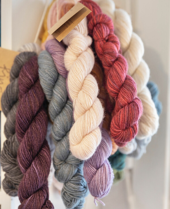 Därför är garnerna i butiken noga utvalda och hennes kunder får välja på kvalitetsgarn av ull, merinoull, alpacka, mohair, lin, hampa och bomull.