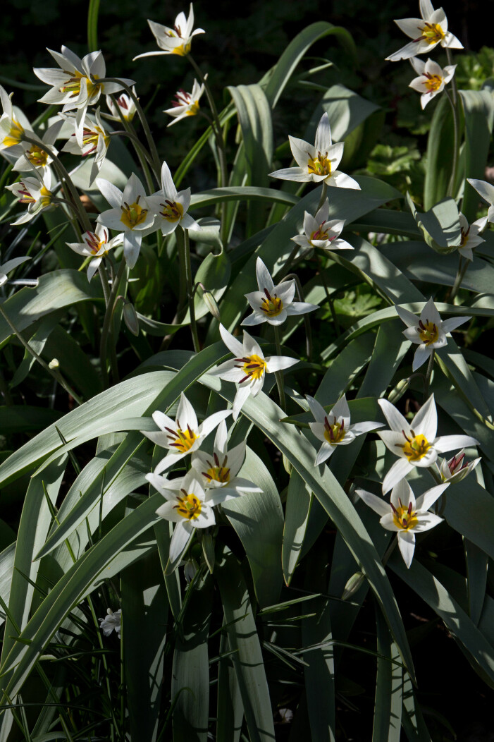 Söta lilla dvärgtulpanen, Tulipa turkestanica, blommar tidigare än förädlade tulpaner. Blomhuvudet är mindre, men det är ofta fler än en blomma på varje stjälk. Porslinstulpan, Tulipa polychroma, är en annan av få vita vilda tulpaner.